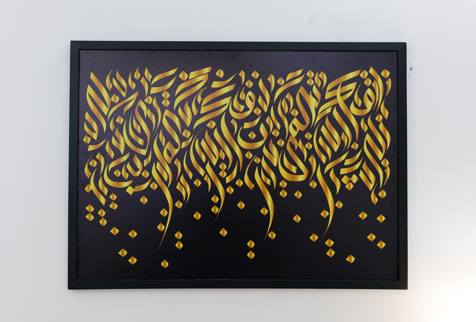 Ce tableau saisissant, encadré d’un noir profond, présente un fond également noir qui crée une atmosphère mystérieuse et élégante. Le contraste entre le noir du fond et le doré de l’écriture crée un effet visuel captivant, attirant immédiatement le regard. Chaque lettre semble danser sur le tableau, racontant une histoire ou transmettant un message poétique. Ce tableau, à la fois moderne et intemporel, est parfait pour apporter une touche de luxe et de mystère à n’importe quel espace